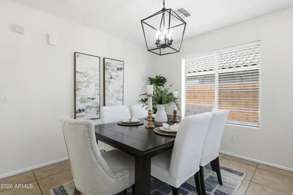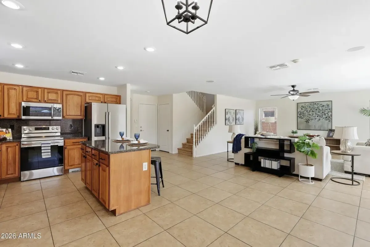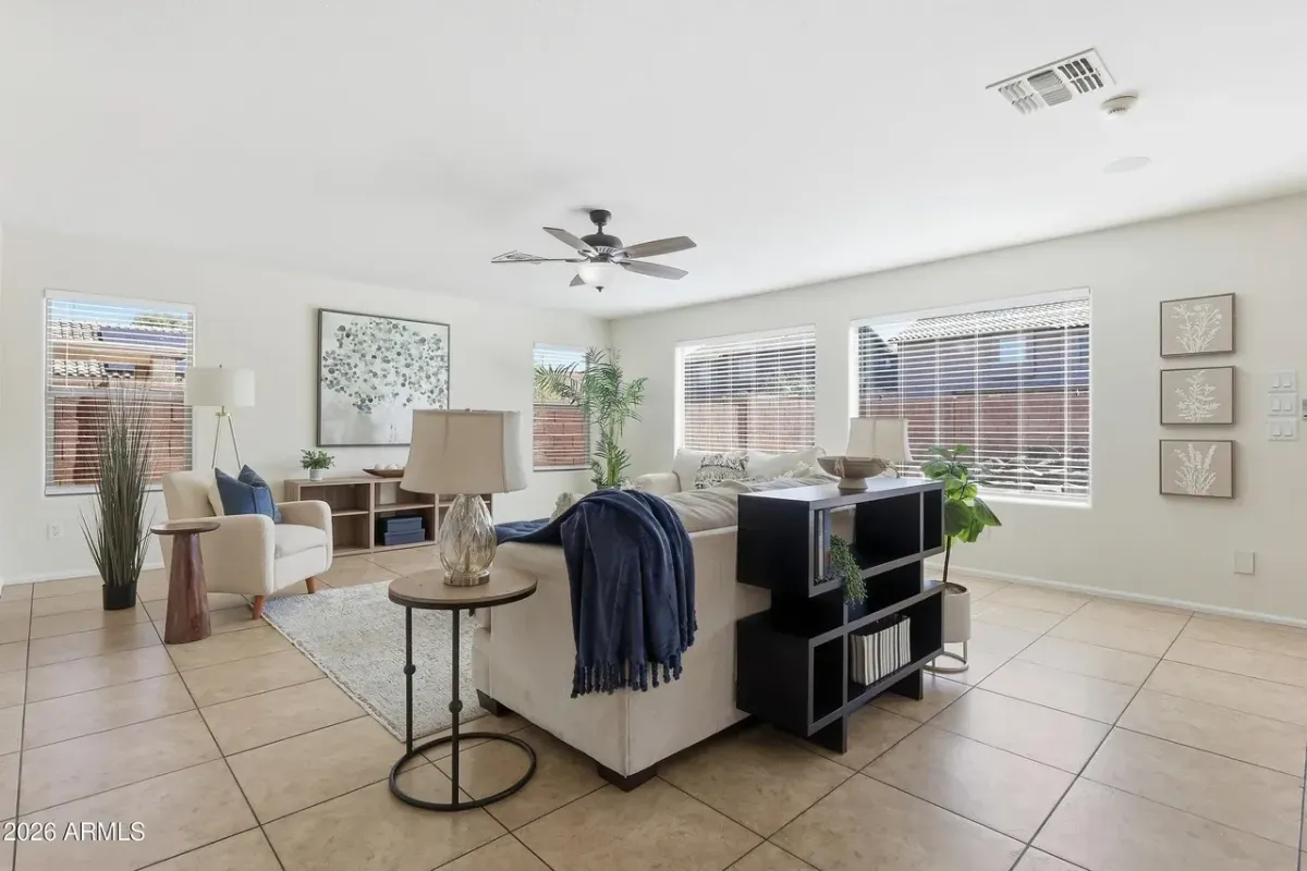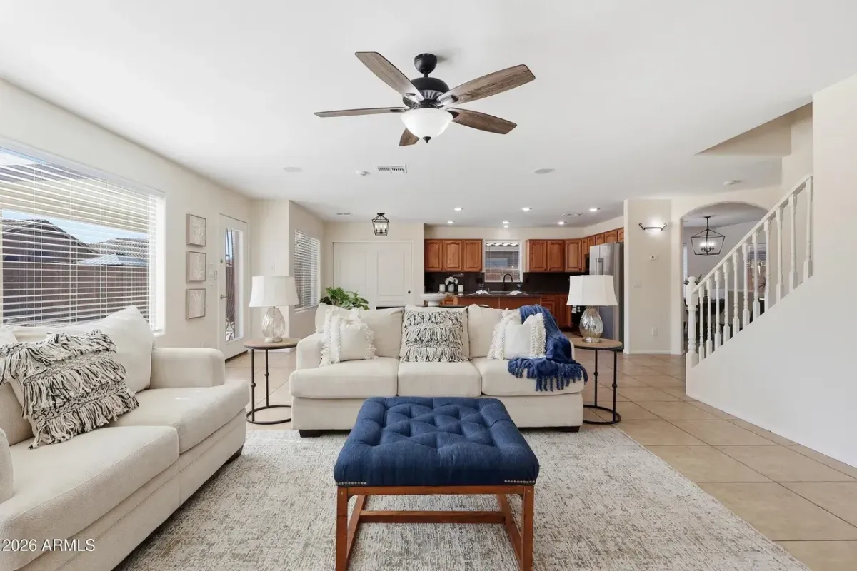Move-in ready 5-bedroom, 3-bath single-family home located in the desirable San Tan Valley community. This spacious and well-maintained property features updated flooring, fresh interior and exterior paint, and a bright open layout designed for comfortable living. Tile flooring enhances the downstairs living areas, while luxury vinyl plank flooring adds style upstairs.