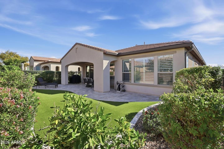 Step outside to enjoy seamless indoor-outdoor living with a covered patio, low-maintenance turf yard, and a pavered seating area framed by mature landscaping. The garage is thoughtfully equipped with a cutout for a water softener, reverse osmosis system, and water heater. The spacious primary suite includes a large walk-in shower and excellent storage. Ideally located with quick access to Queen Creek amenities, residents also enjoy resort-style living with private clubs, championship golf, spa services, dining, pools, social events, and more.