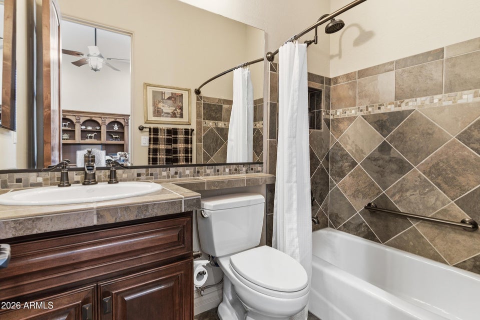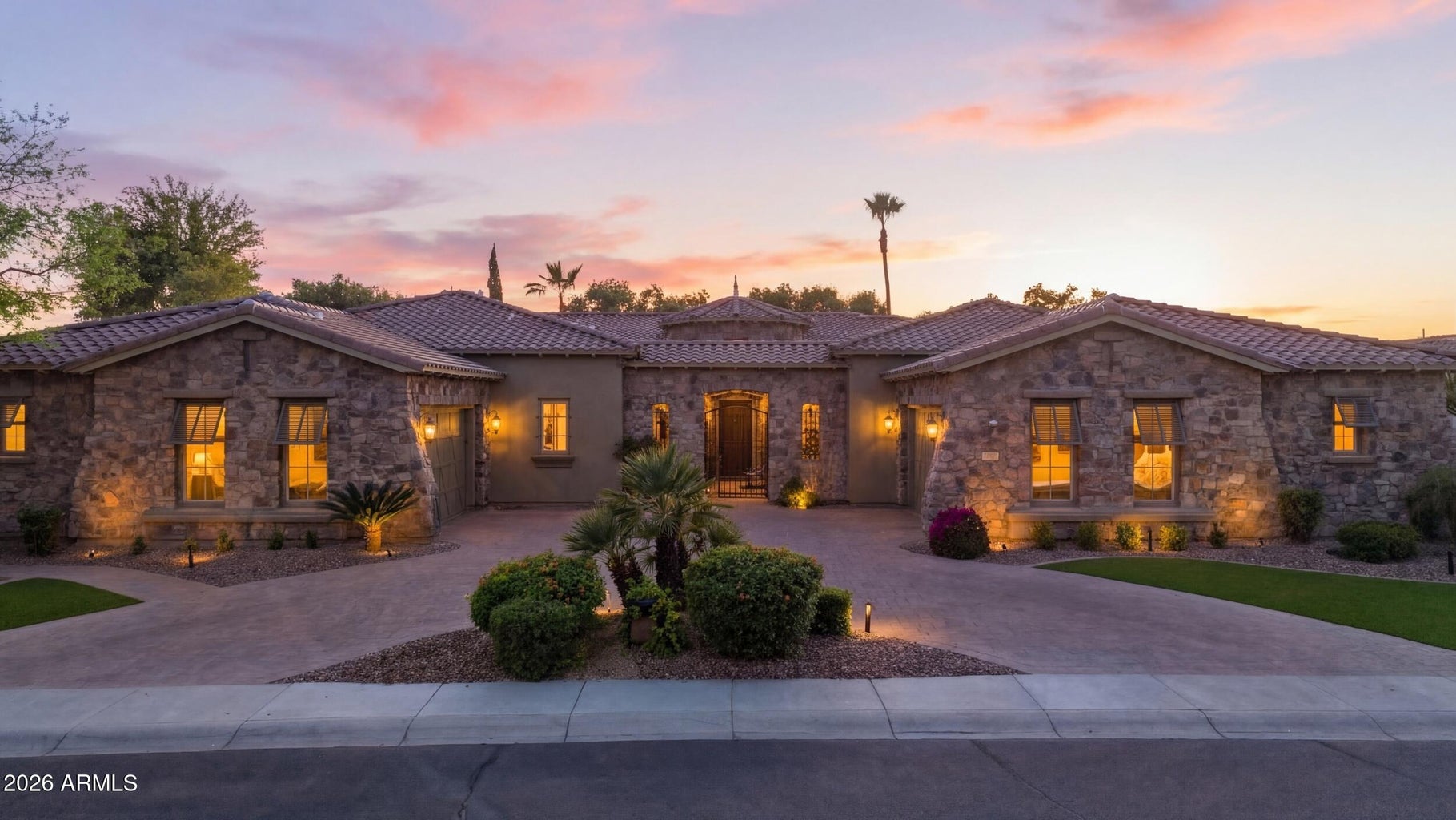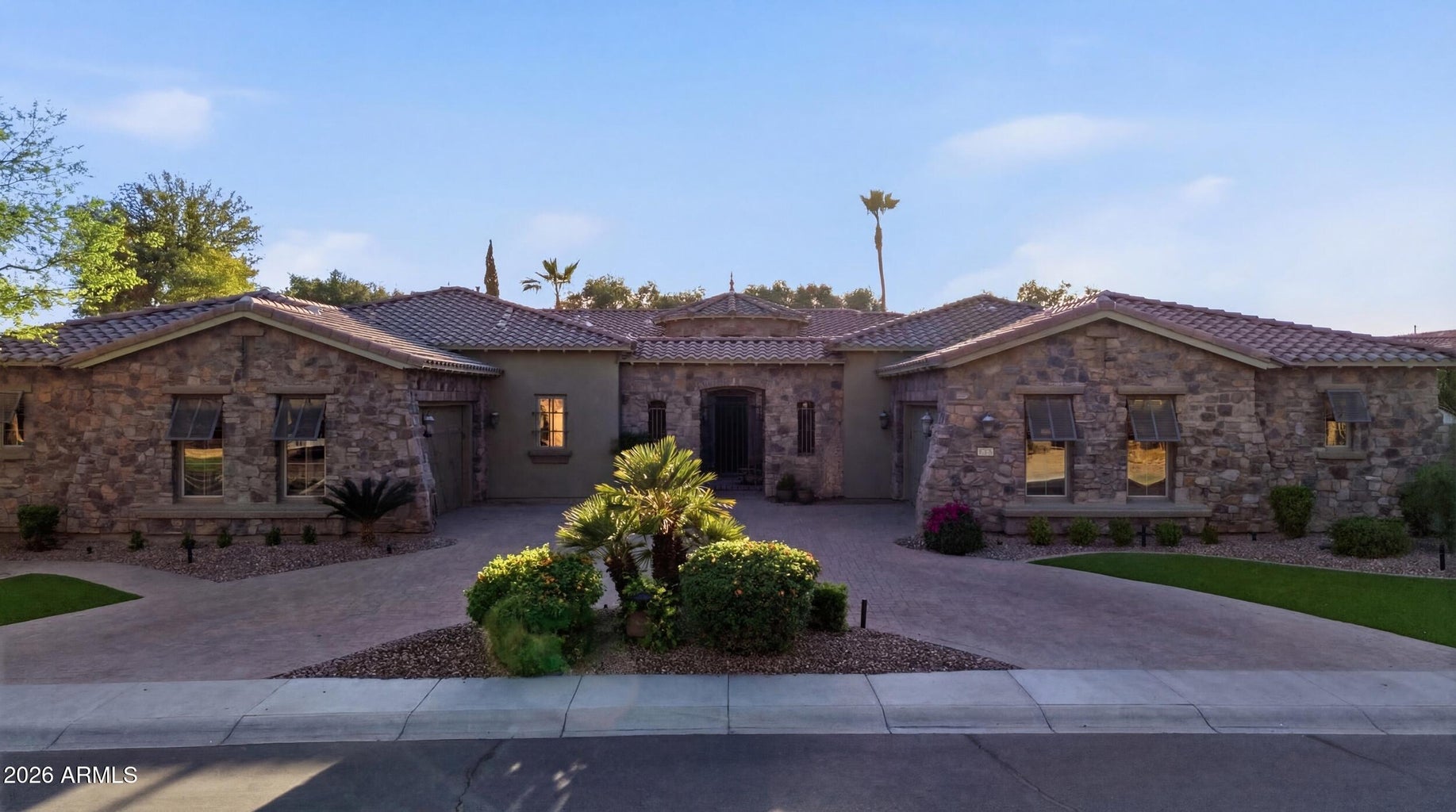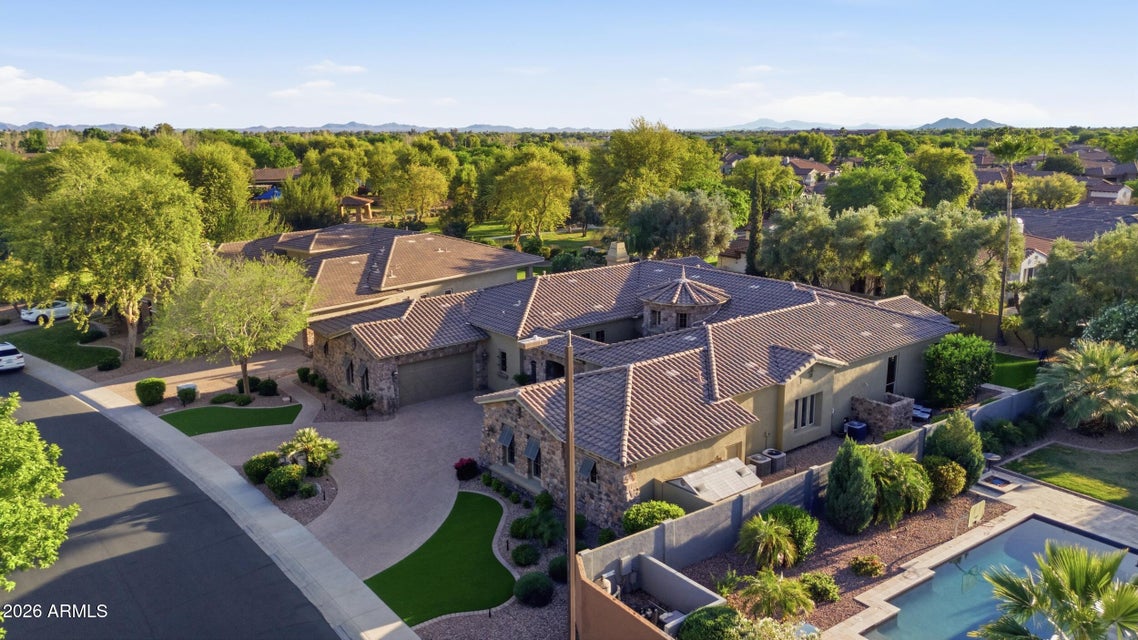 Situated within a prestigious gated community, this exceptional single-level residence offers 4 bedrooms, 3.5 baths, a versatile flex room, and an expansive 4-car garage with two air-conditioned bays. A circular paver driveway and private courtyard entry lead to a grand foyer with soaring ceilings and seamless views of the resort-style backyard.