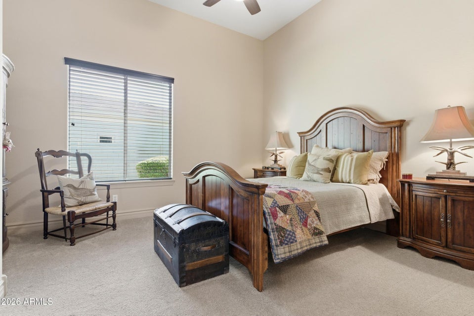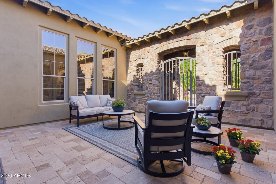 Exceptional single level luxury home in a gated community featuring 4 beds, 3.5 baths, flex room with walk in closet, and a 4 car garage with 2 air conditioned bays. A circular paver driveway and gated courtyard entry lead to a tranquil portico and wood front door opening to a dramatic foyer with soaring ceilings and sightline to the resort style backyard. Interior highlights include hardwood floors, alder doors and trim, crown molding, wood shutters, and natural light throughout. The split primary retreat offers a coffered ceiling, backyard access, spa style bath, and dual oversized walk in closets. The kitchen features KitchenAid appliances and a Wolf gas cooktop, with additional entertaining features and outdoor living details in the supplement.