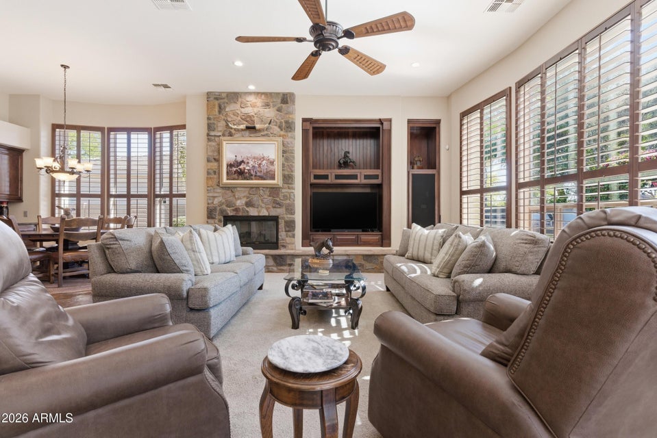 The kitchen and adjoining spaces are thoughtfully designed for both everyday living and entertaining. KitchenAid appliances, a Wolf gas cooktop, Bosch dishwasher, and generous cabinetry provide excellent functionality, while the butler's area leads to a walk in wine room, creating an ideal space for entertaining and storage.
